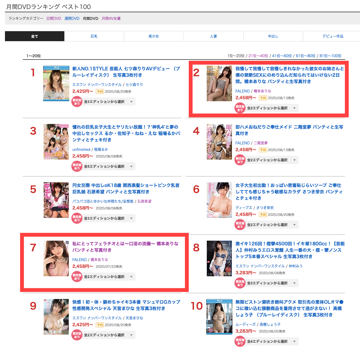 这是高桥的部分,另一个值得好好聊的女优是桥本ありな(桥本有菜)ー她是另一个累积销售量胜过七ツ森りり(七森莉莉)出道作的专属女优,而且和高桥一样,她也是两支作品进榜,但这位长腿妹子靠的并不是新作预约拉尾盘,而是那两支作品都很卖: