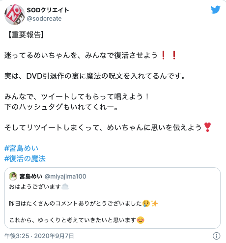 是怎样?今天SOD的官方twitter发文,告诉大家因为宫岛めい(宫岛芽衣)现在留学去不成了,有很多人希望这位只发了两片就引退的大学生回归战线;但到目前为止,宫岛めい(宫岛芽衣)还在犹豫不知道要不要回来多啪几下,所以请大家勤念咒语,给这位梦想成为幼教老师的大学生勇气: